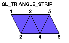 GL_TRIANGLE_STRIP은 첫 삼각형을 그릴 때는 3개의 정점이 필요하지만 다음 삼각형을 그릴 때에는 한 개의 정점만 필요합니다. 이전 삼각형의 마지막 정점 두 개를 재 사용하기 때문입니다. 예를 들어 v1, v2, v3 로 삼각형을 그린 후 새로운 정점 v4를 추가하면 v2, v3, v4 로 삼각형이 그려집니다.